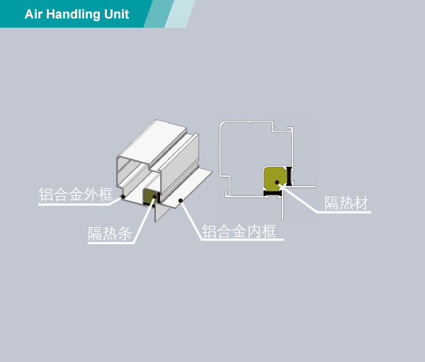 yl23411永利新一代MAH组合式空气处理机,艾洛斯(Aiolos)系列,采用防冷桥铝合金框架结构设计,面板与框架为压扣连接方式。